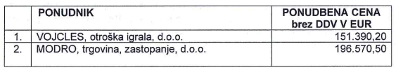 Na javno naročilo sta prispeli dve ponudbi, in sicer ponudba ponudnika Modro, trgovina, zastopanje, v višini 105.570,50 evra in ponudba ponudnika Vojcles, otroška igrala, v višini 151.390,20 evra.
