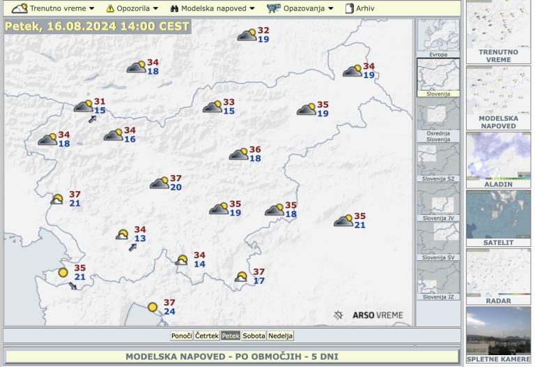 Najnižje jutranje temperature bodo od 13 do 20, na Primorskem do 22, najvišje dnevne od 31 do 37 stopinj Celzija.