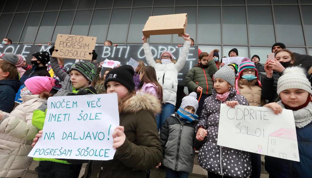 Protesti zaradi zapiranja šol v regijah s slabšo epidemiološko sliko so se po sobotnem protestu v Trbovljah danes nadaljevali v številnih krajih po državi. Tudi v Mariboru.