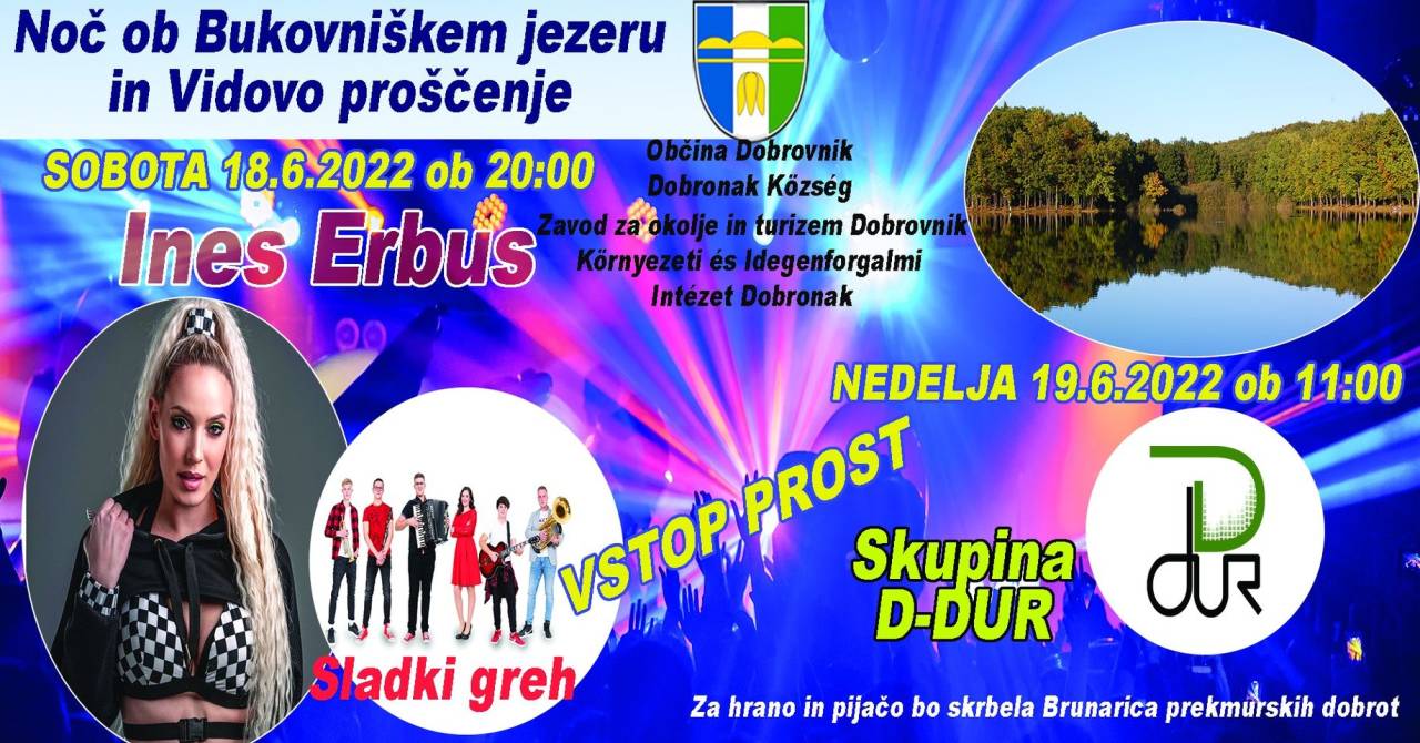 V soboto, 18. junija, ob 20. uri se obeta tudi Noč ob Bukovniškem jezeru. Nastopili bosta predskupina Sladki greh ter priljubljena slovenska pevka Ines Erbus.