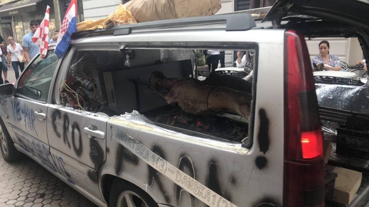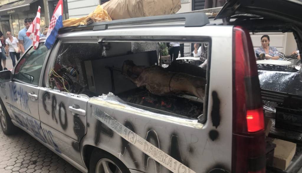 Včeraj so ulice in trge Zagreba preplavili navijači, ki so stiskali pesti za svoje nogometaše. Poleg vseh možnih izvedb rdeče-belih kock, je včeraj veliko pogledov privabljal tudi domačin, ki je na zelo izviren način ponudil odojka.