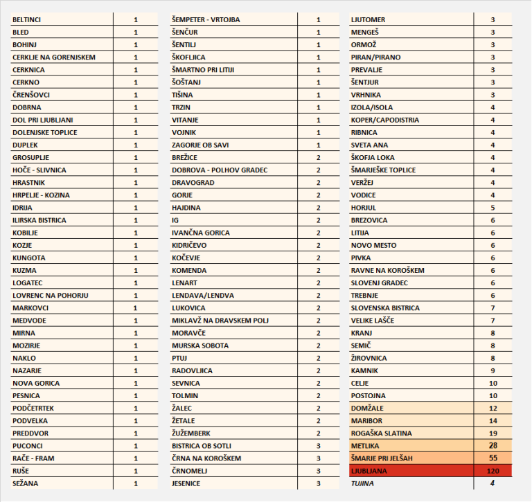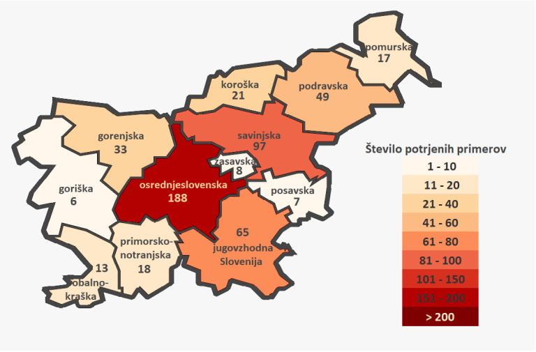 Kot beležijo na NIJZ, je vsaj en primer okužbe COVID-19 potrjen v 113 občinah (53 % vseh slovenskih občin), več kot dva primera okužbe COVID-19 sta bila potrjena v 64 občinah.