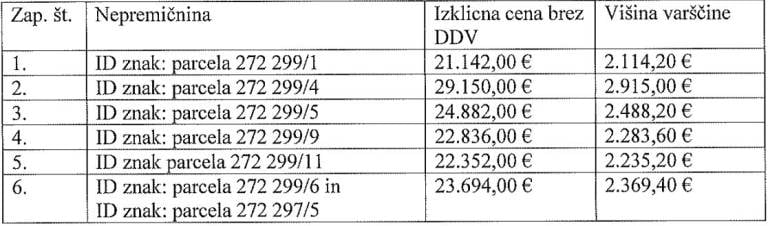 Izhodiščno vrednost nepremičnine znaša 105.020,00 evrov, h kateri se prišteje še znesek vplačil v rezervni sklad, ki znaša 27,27 evra, kupec pa poravna tudi strošek izdelave poročila cenitve, ki znaša 365 evrov.