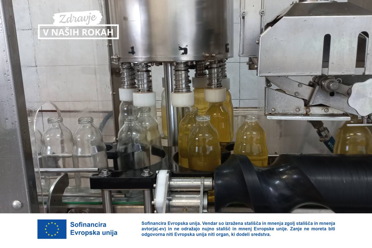 Sveže iztisnjeni sok napolnijo v visoke sode, od koder po ceveh steče v stroj za stekleničenje.