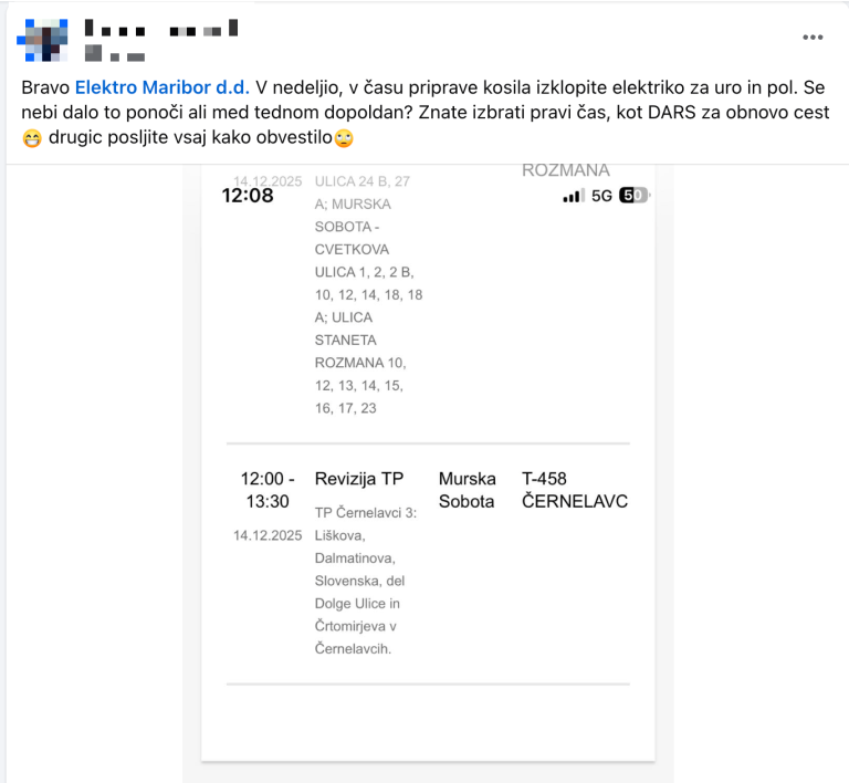 Bralec iz Černelavcev je na družbenem omrežju Facebook opozoril na nenavadno izbiro termina, saj so izklopi potekali ravno v času priprave nedeljskega kosila. Ob tem pa opozoril tudi na pomanjkljivo obveščanje Elektra Maribor o načrtovanih izklopih.