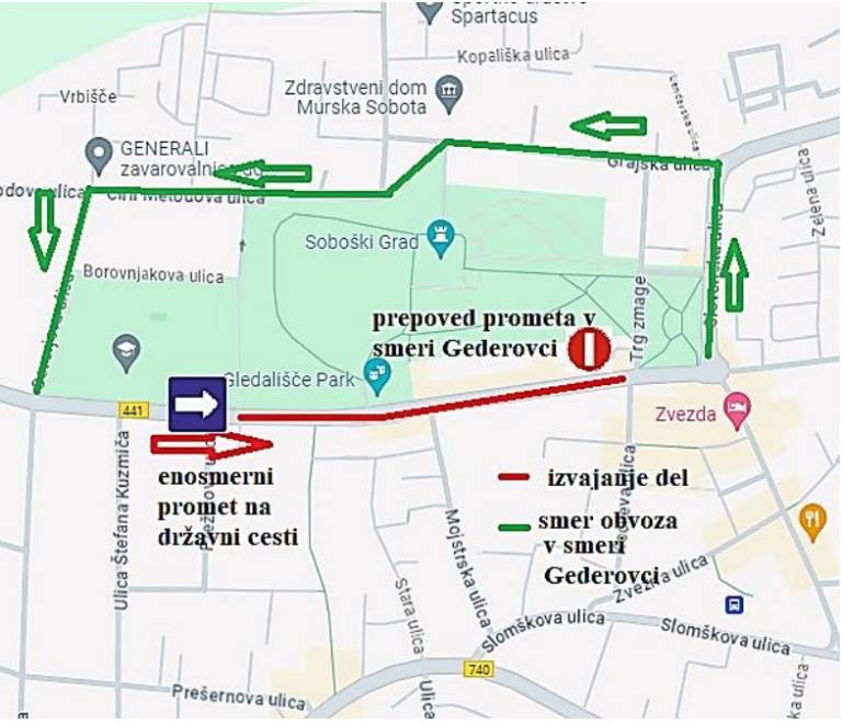 Promet bo tukaj preusmerjen na nasprotni vozni pas, enosmerni promet v smeri Murska Sobota (središče). Iz smeri Murska Sobota (središče) v smeri Gederovci pa bo promet onemogočen in preusmerjen po vzporedni lokalni cesti v smeri Slovenska ulica (krožišče pri Zvezdi) – Grajska ulica – Ciril Metodova ulica – Severjeva ulica.