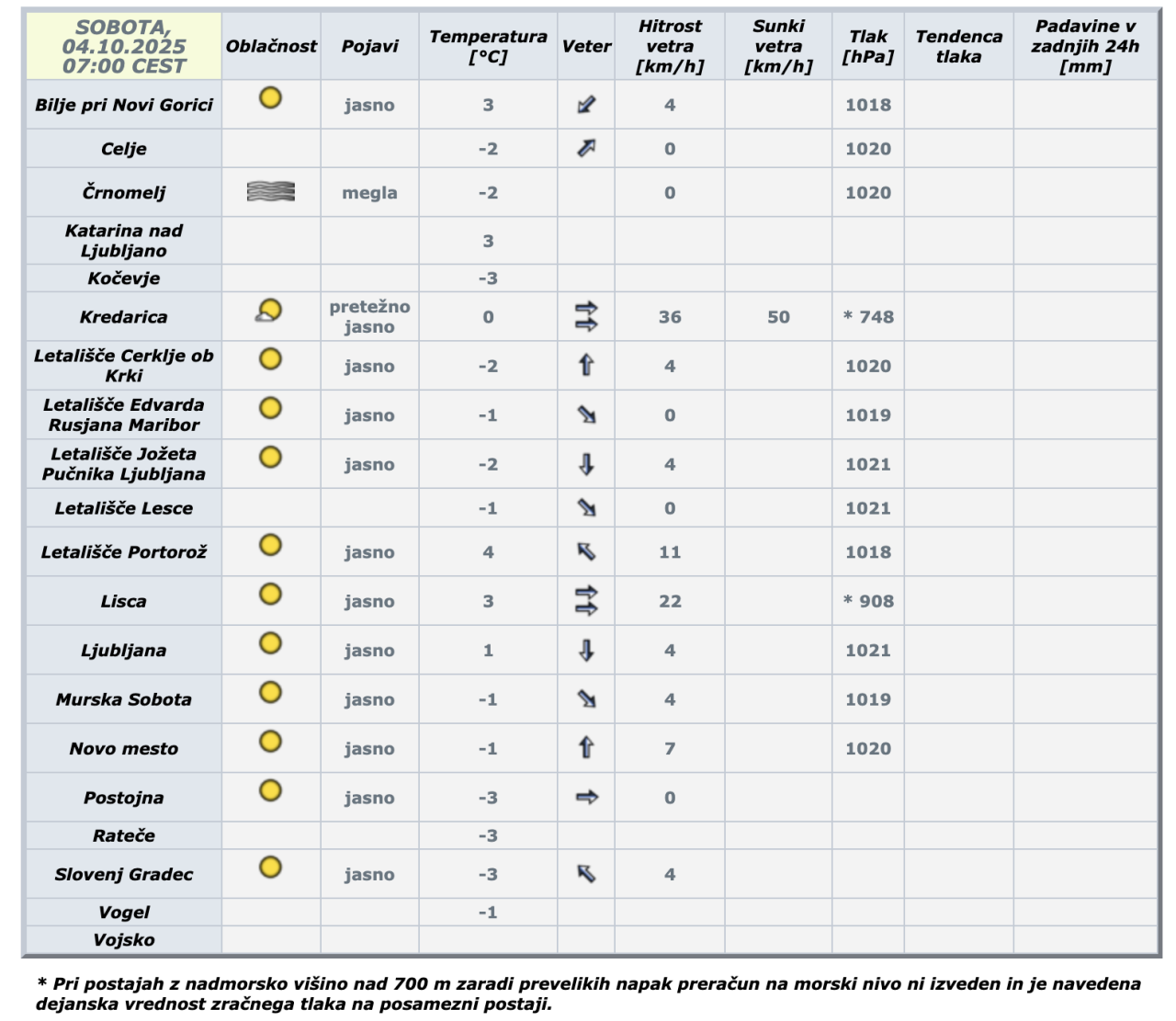 Prevladuje jasno vreme, megla se je zadrževala le na območju Črnomlja, kjer je bila jutranja temperatura minus dve stopinji Celzija. Na Kredarici je bilo sicer nič stopinj, vendar s sunkovitim vetrom do 50 kilometrov na uro.