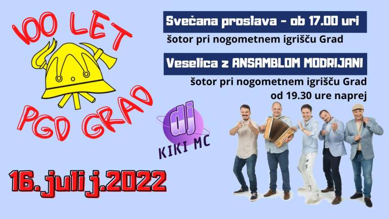 Prostovoljno gasilsko društvo Grad praznuje 100. obletnico ustanovitve. Ob tej svečanosti jutri, 16. julija 2022 za obiskovalce pripravljajo svečano proslavo in gasilsko veselico z Ansamblom Modrijani.