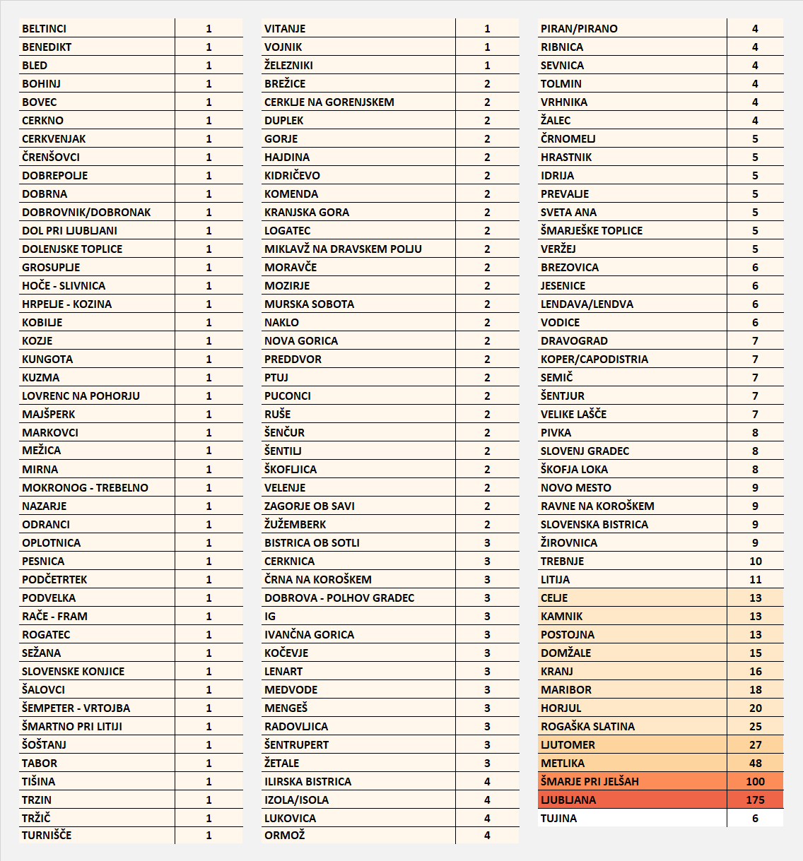 Do 31.3.2020 (do 24.00) je bil vsaj en primer okužbe COVID-19 potrjen v 133 občinah (63 % vseh slovenskih občin), več kot dva primera okužbe COVID-19 sta bila potrjena v 85 občinah.