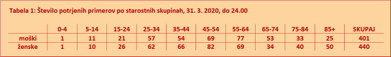 Do 31.3. do 24. ure je bilo opravljenih 23.762 testiranj, od tega je bilo 855 pozitivnih testov.