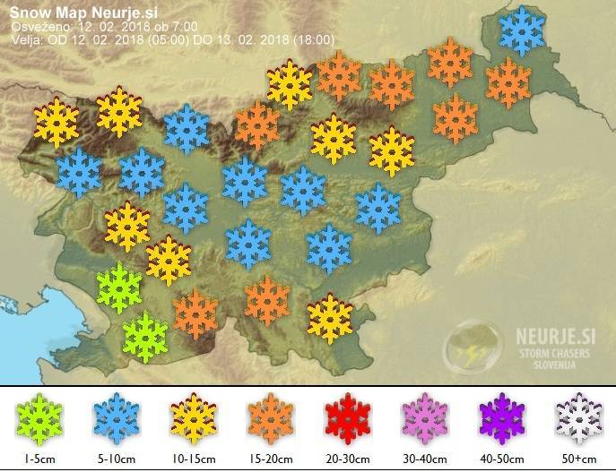 Ponekod na Štajerskem in še kje na severu Slovenije, ter kasneje tudi na jugu države lahko zapade od 15 do 20 cm novega snega, lokalno tudi več. Drugod po državi bo, po nižinah, zapadlo od 5 do 15 cm svežega snega. Najmanj snega bo v delu Ljubljanske kotline in seveda po nižinah Primorske. Kakšna snežinka ni izključena tudi v bližini morja, piše portal Neurje.si.