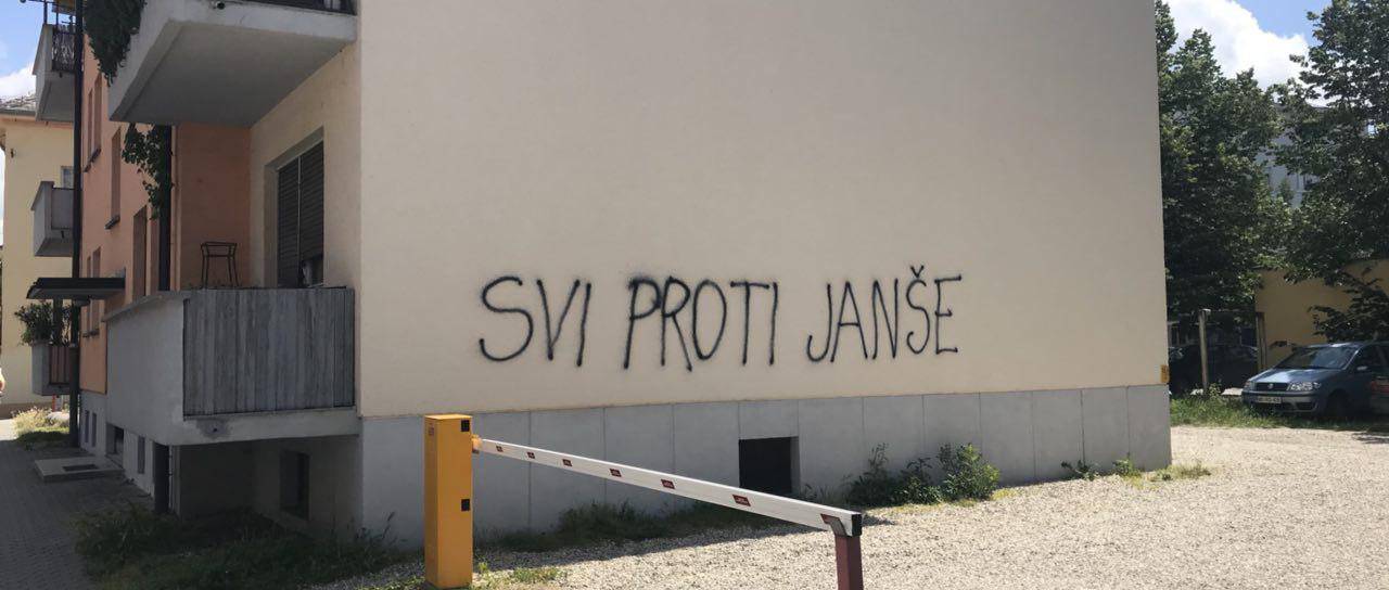 Na steni stanovanjskega bloka nasproti Blagovnice smo namreč opazili precej velik napis ''Svi proti Janše'', ki se je tam pojavil čez noč.