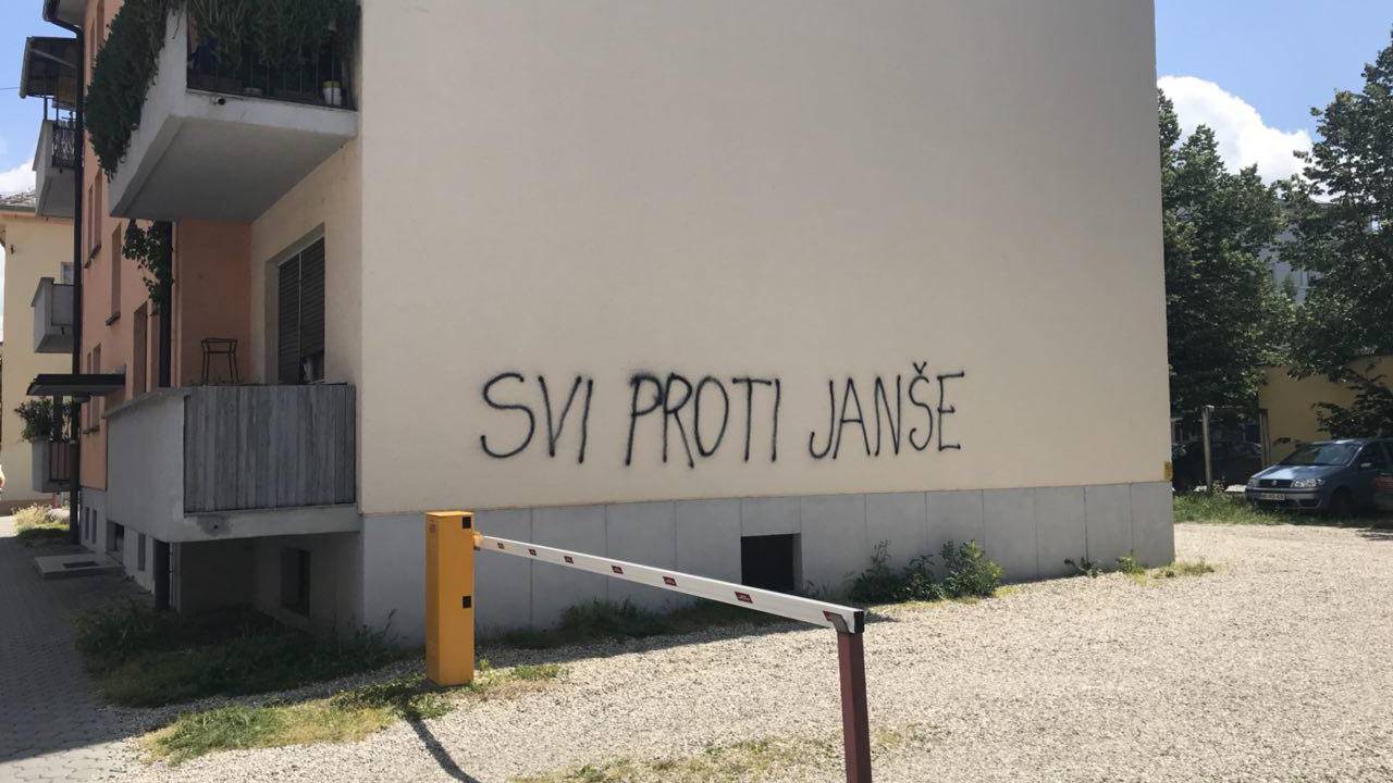 Na steni stanovanjskega bloka nasproti Blagovnice smo namreč opazili precej velik napis ''Svi proti Janše'', ki se je tam pojavil čez noč.