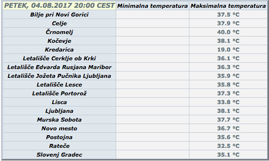 Največ so čez dan namerili v Črnomlju, kjer se je temperatura na merilnem mestu Črnomelj - Dobliče povzpela na 40 stopinj Celzija, 39.4 pa so izmerili v Prekmurju.