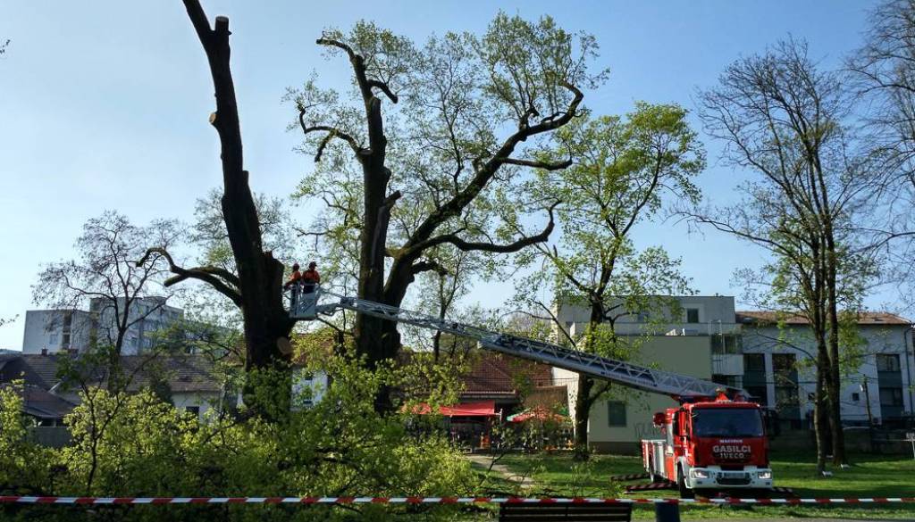 Zob časa je načel mogočna hrasta, ki sta rasla na rahli vzpetini v južnem delu murskosoboškega mestnega parka.