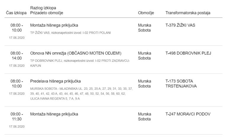Glede na predvidene izpade in izklope, je sicer za današnji dan predvideno tudi prizadeto območje na Mladinski ulici in Ulici Ivana Regenta zaradi predelave hišnega priključka.