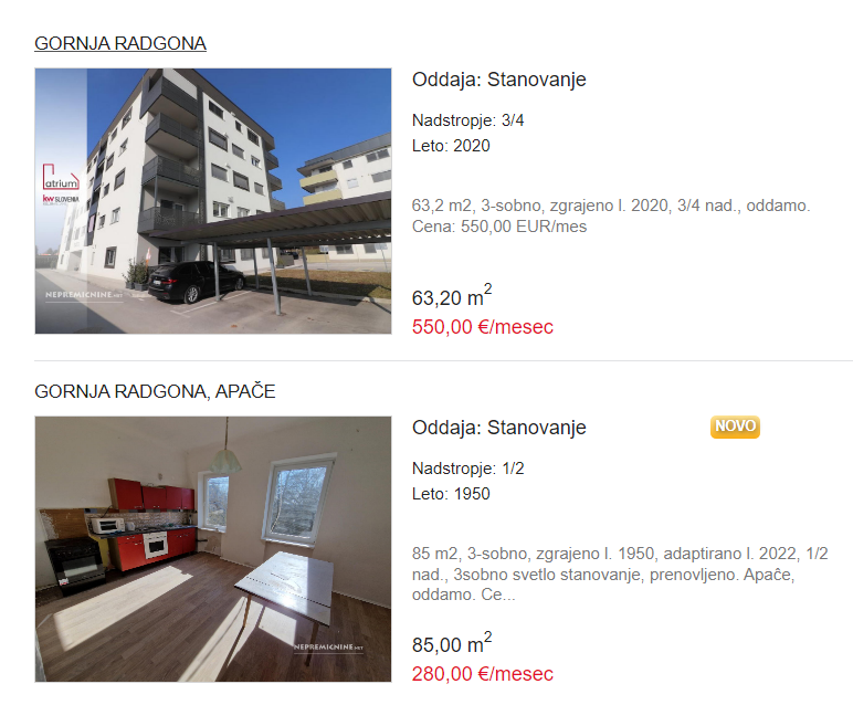 Tudi cena za najem ni med tem nič kaj obetavna. Za trisobno stanovanje oziroma 63,2 kvadratnih metrov v Gornji Radgoni je treba odšteti 550 evrov mesečno, za trisobno stanovanje v Apačah oziroma 85 kvadratnih metrov pa 280 evrov mesečno.