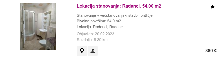 Zasledimo lahko oglas za dvosobno stanovanje v Radencih, površine 54 kvadratnih metrov, ki se oddaja za 380 evrov mesečno ali pa trisobno stanovanje v naselju Gomilica, ki se oddaja za 300 evrov mesečno. V Murski Soboti je na njihovem portalu na voljo samo garsonjera velikosti 24 kvadratnih metrov, ki se oddaja za 190 evrov na mesec.