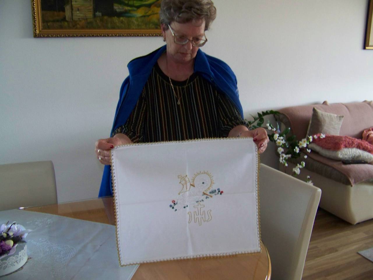 Marija, kot ljudska umetnica in mojstrica šivanja in kvačkanja prtičkov, je prtiček za veliko noč sama obšila z motivom ovčke in Jezusa Kristusa.