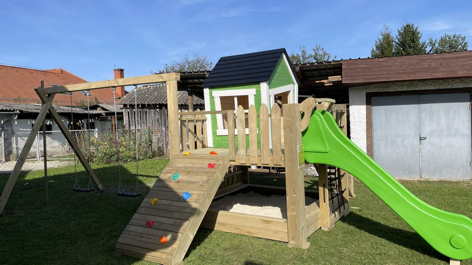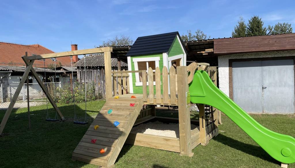Postavljeno igralo vključuje podest s hiško, plezalno steno, tobogan, gugalnici in peskovnik.