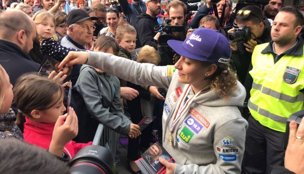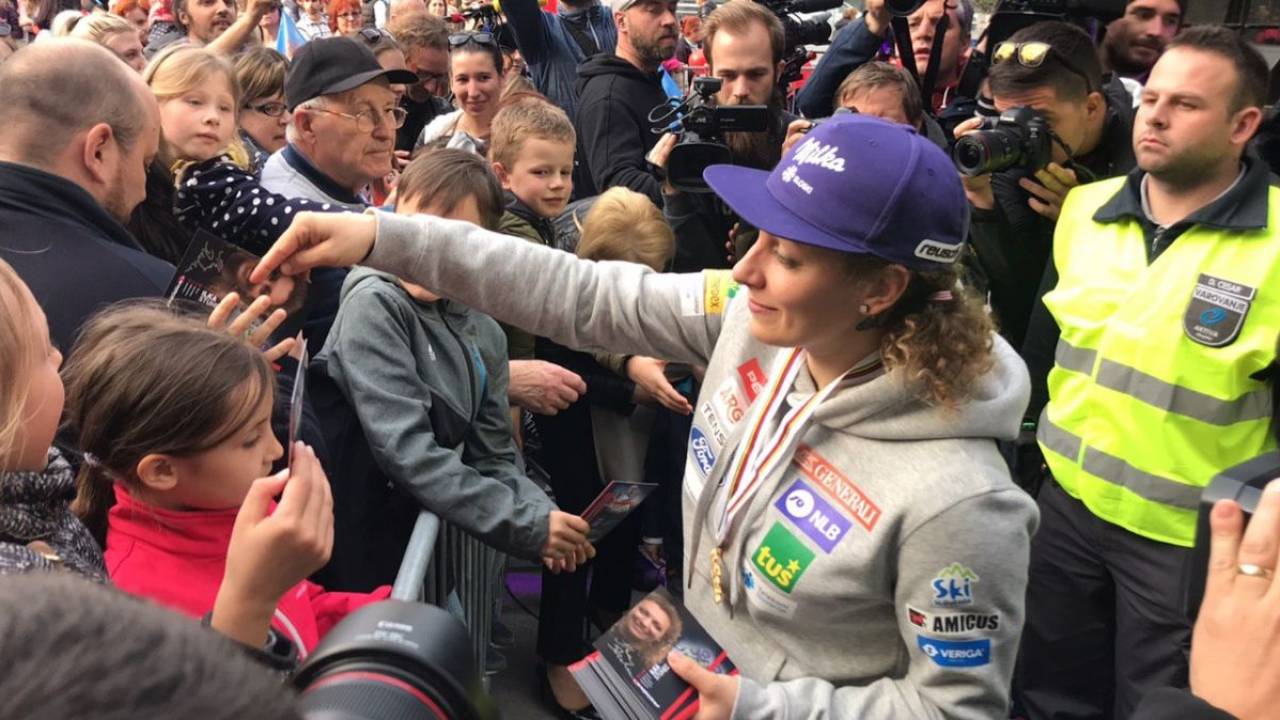 Okoli sto radovednežev je na Trgu Leona Štuklja pripravilo velik sprejem svetovne prvakinje v smuku Ilke Štuhec.