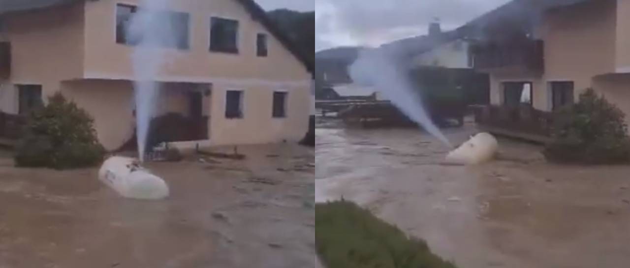 Zaradi poplav je v Novih Lokah pri Mozirju odtrgalo plinsko cisterno, hudournik pa jo sedaj nosi med hišami.