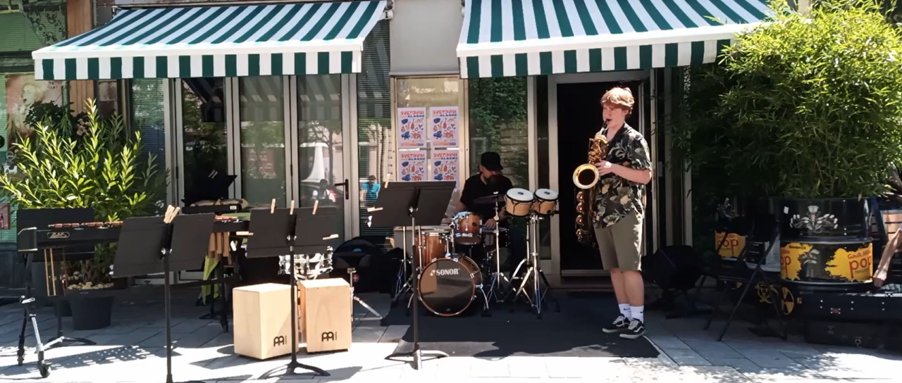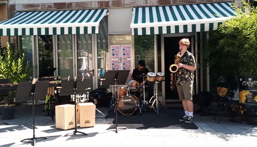 Pred barom Bunker na Slovenski ulici so že dopoldne zavibrali zvoki tolkal, saksofona in kitare, ki so privabljali mimoidoče, obiskovalce kavarne in sprehajalce iz parka.