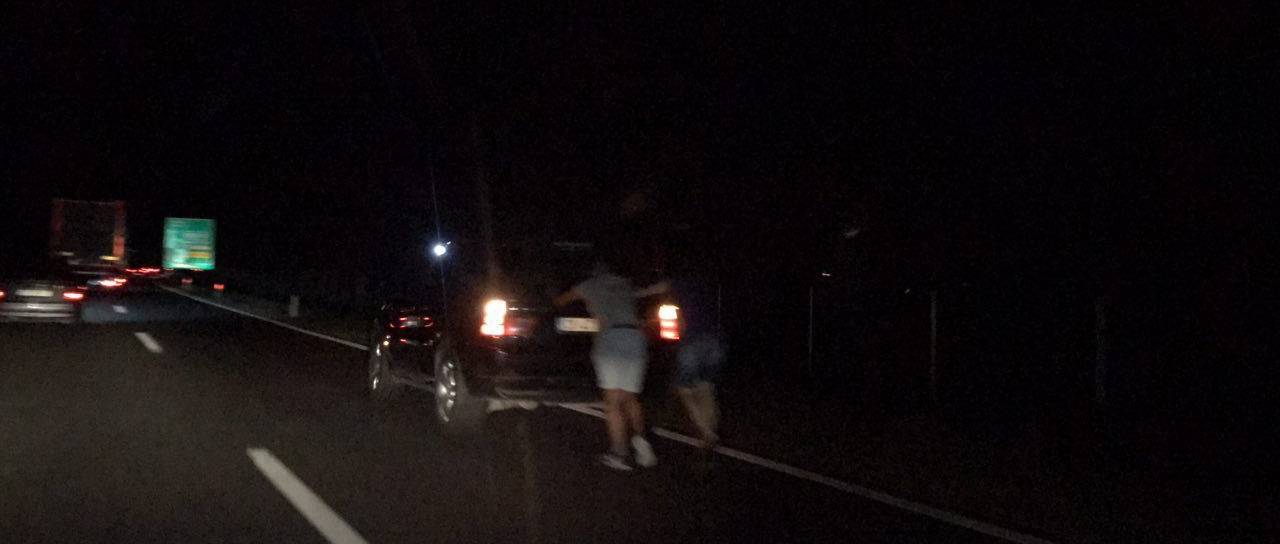 Mimovozeči so komaj verjeli svojim očem, ko so videli, da dva moška po avtocesti brez odstavnega pasu v temi porivata pokvarjen avtomobil.