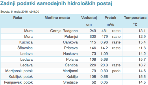 Danes in jutri je sicer pričakovati večinoma upadanje vodnatosti rek po državi. Počasi bodo naraščale le reke s kraškim zaledjem in Mura, ob posameznih nevihtah pa so danes še možni prehodni hitrejši porasti predvsem manjših vodotokov.