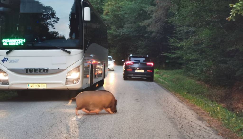 Mimovozeči opozarjajo voznike, naj bodo pri vožnji na omenjeni relaciji še posebej pozorni, saj se prašič lahko znajde kar sredi cestišča.
