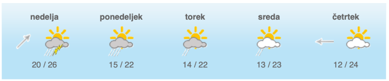 Pihal bo okrepljen jugozahodni veter, ob morju jugo. Najvišje dnevne temperature bodo od 20 do 26, ob morju in na vzhodu do 29 stopinj Celzija.