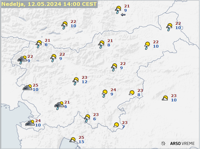 V nedeljo bo sprva večinoma sončno, popoldne pa v notranjosti Slovenije spremenljivo oblačno s kakšno ploho ali nevihto. Najnižje jutranje temperature bodo od 6 do 12, najvišje dnevne od 20 do 26 stopinj Celzija.