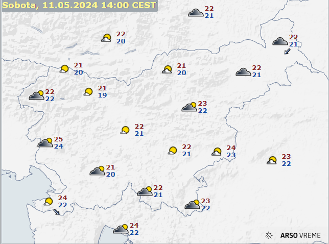 Najvišje dnevne temperature bodo od 20 do 24, na Goriškem do 26 stopinj Celzija.