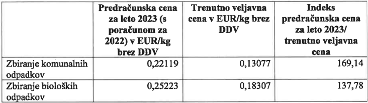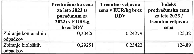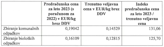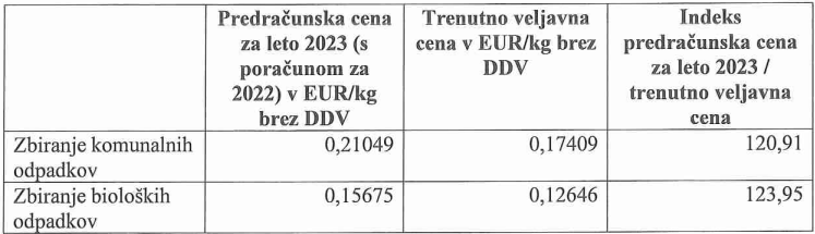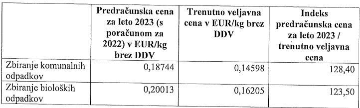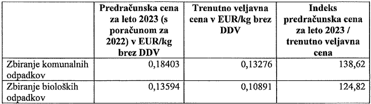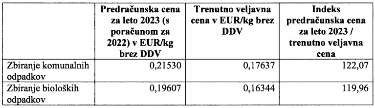 Za kilogram zbiranja bioloških odpadkov bodo občani po novem odšteli 0,19607 evra brez davka na dodano vrednost, kar je za 0,03263 evra več, kot do sedaj, kar pomeni za 19,96-odstotno povišanje.
