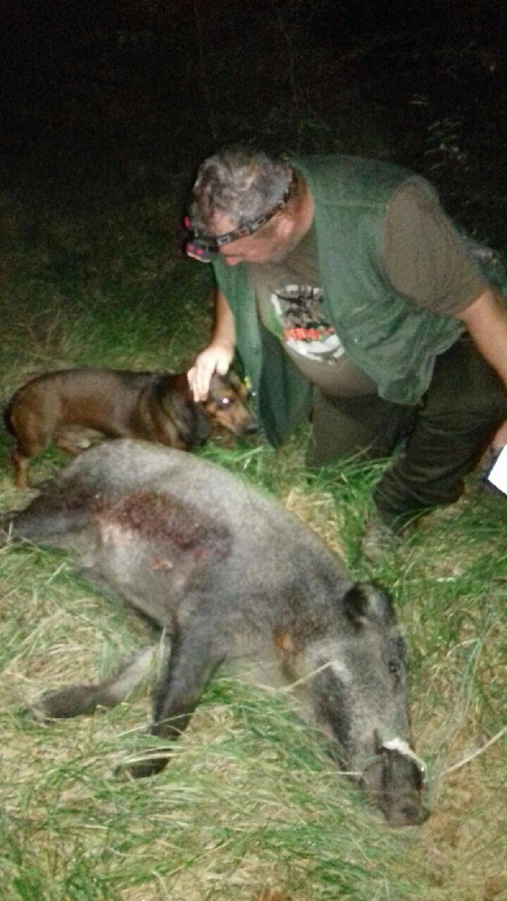 Lovec Marko Volk s svojim jazbečarjem ujel divjega prašiča
