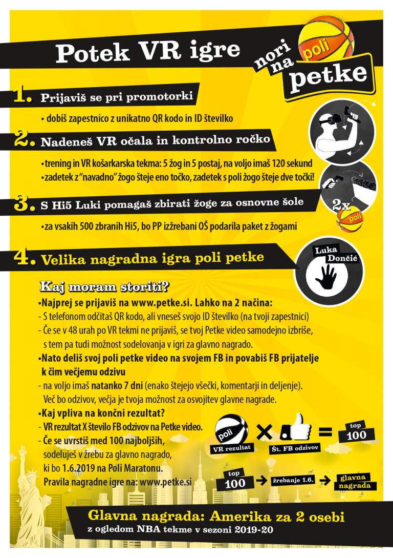 »Osrednji namen VR Poli Petke je aktivacija javnosti na dogodkih - čim več ljudi sodeluje v VR košarkarski tekmi, kakovostna izkušnja virtualne resničnosti in osebna interakcija z VR Lukom Dončićem, ki ima dobrodelno noto. VR rezultati se seštevajo v košarkarske žoge za osnovne šole. Slednje bo Perutnina Ptuj z namenom popularizacije košarke med mladimi šolam izročila v prihodnjem šolskem letu. S spletnim deljenjem VR izkušnje in aktivaciji na socialnih omrežjih ter kančkom sreče pa bo osem nagrajencev odpotovalo v Ameriko na ogled NBA tekme v sezoni 2019/2020,« je ob predstavitvi izpostavil Slavko Ficko, direktor strateškega marketinga in razvoja v Skupini Perutnina Ptuj.