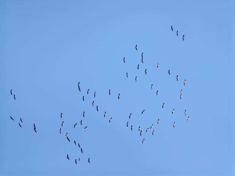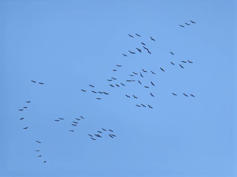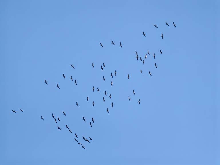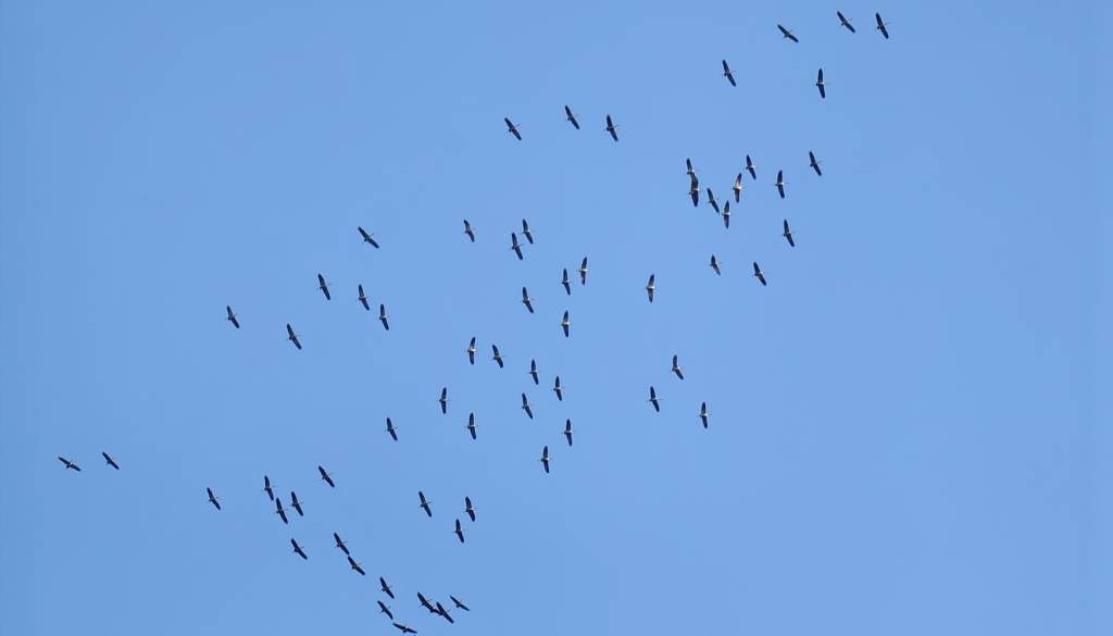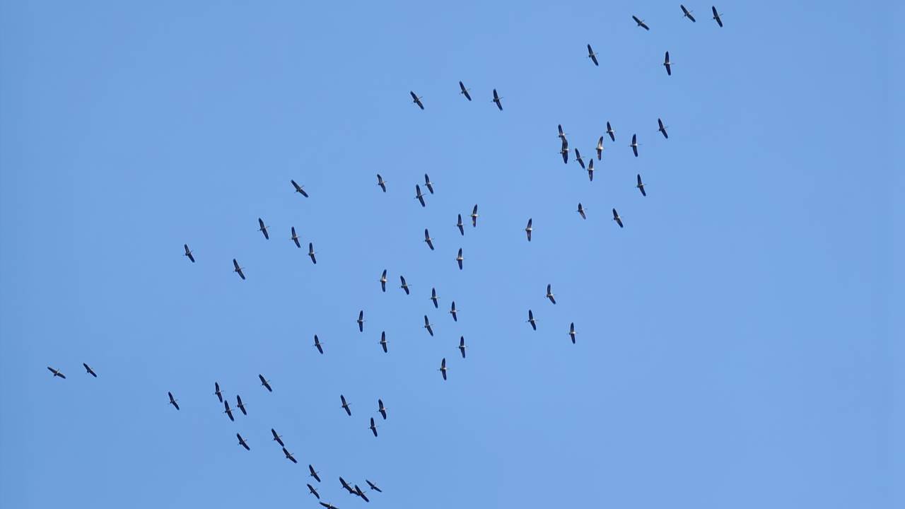 Žerjavi so tvorili prepoznavno V-formacijo, ki je bila vidna na nebu.
