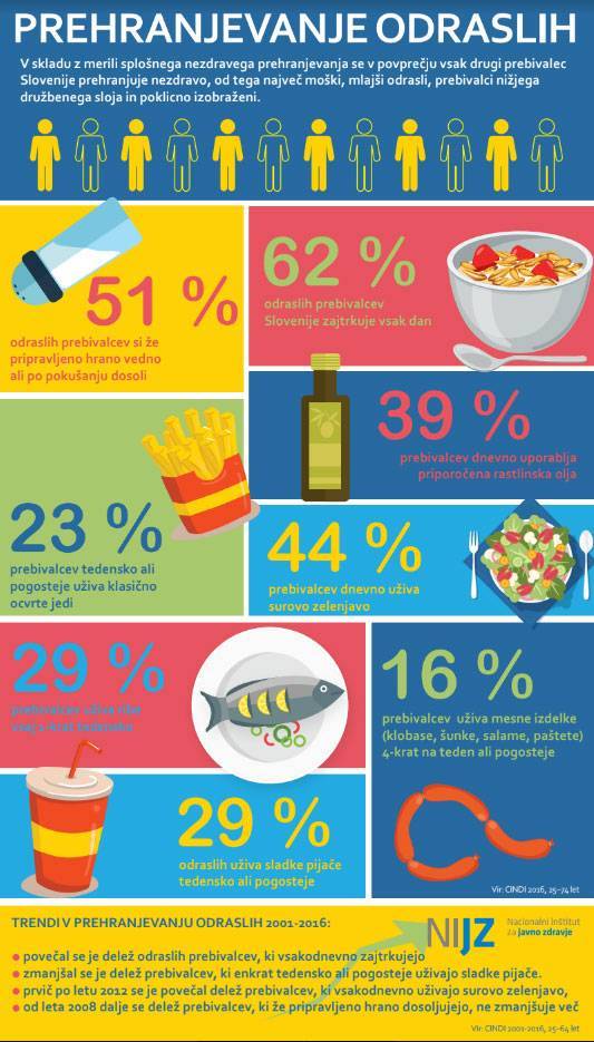 Izsledki NIJZ so med drugim pokazali, da se priporočenih petih obrokov na dan žal drži le dve petini odraslih Slovencev, in čeprav je navada zajtrkovanja v zadnjem desetletju v porastu, ta obrok še vedno izpusti kar 43 odstotkov moških in 33 odstotkov žensk. Bolj vestne so pri tem starejše generacije.