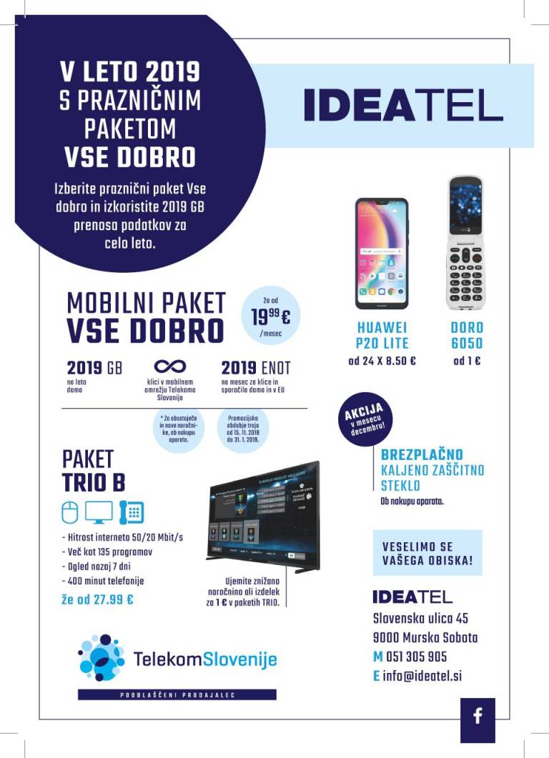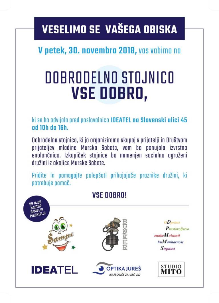 Sicer pa vas v petek, 30. novembra 2018, IDEAtel vabi tudi na Dobrodelno stojnico Vse dobro, ki se bo od 10h do 16h odvijala pred poslovalnico IDEAtel na Slovenski ulici 45 v Murski Soboti.