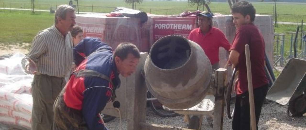 Prostovoljci pri gradnji dvorane Langa