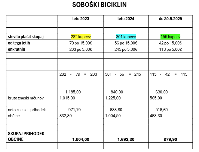 V zadnjih treh letih sistem Soboški biciklin beleži stabilno uporabo, vendar z opaznim premikom v strukturi uporabnikov.