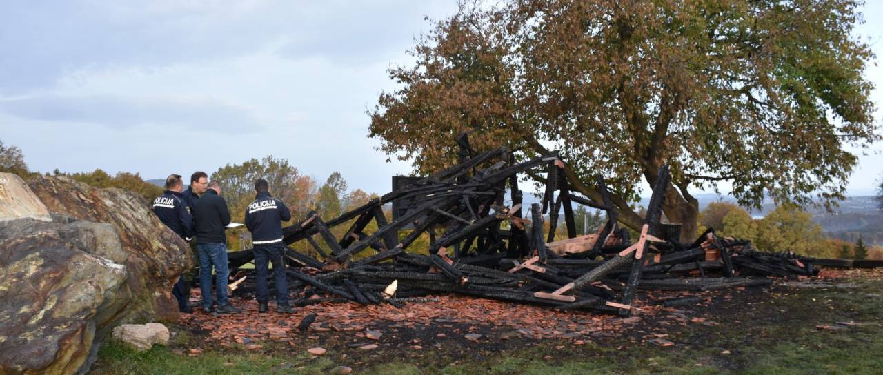 Od razglednega stolpa na Sotinskem bregu, ki je pogorel 24. oktobra 2022, je ostal le kup požganega lesa. Ob razglednem stolpu sta tistega ponedeljkovega jutra zgorel še koš za smeti in reklamni pano.