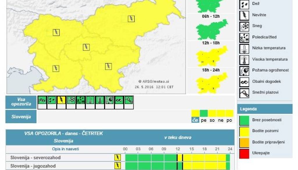 Agencija Republike Slovenije za okolje je za danes za vso državo izdala rumeno stopnjo ogroženosti. Možni so torej močnejši nalivi, piš vetra in udari strel, zato je vsekakor smiselno ostati pozoren na bližajoče se nevihtne oblake.