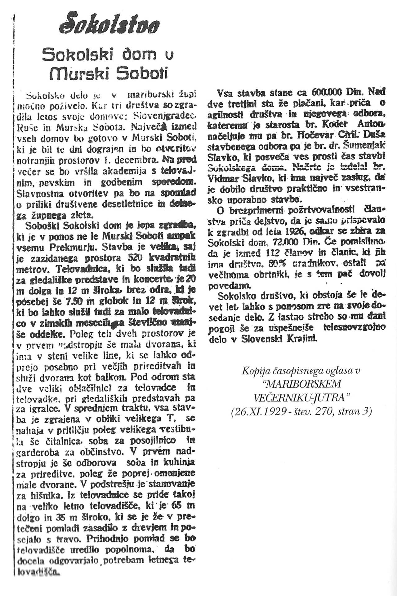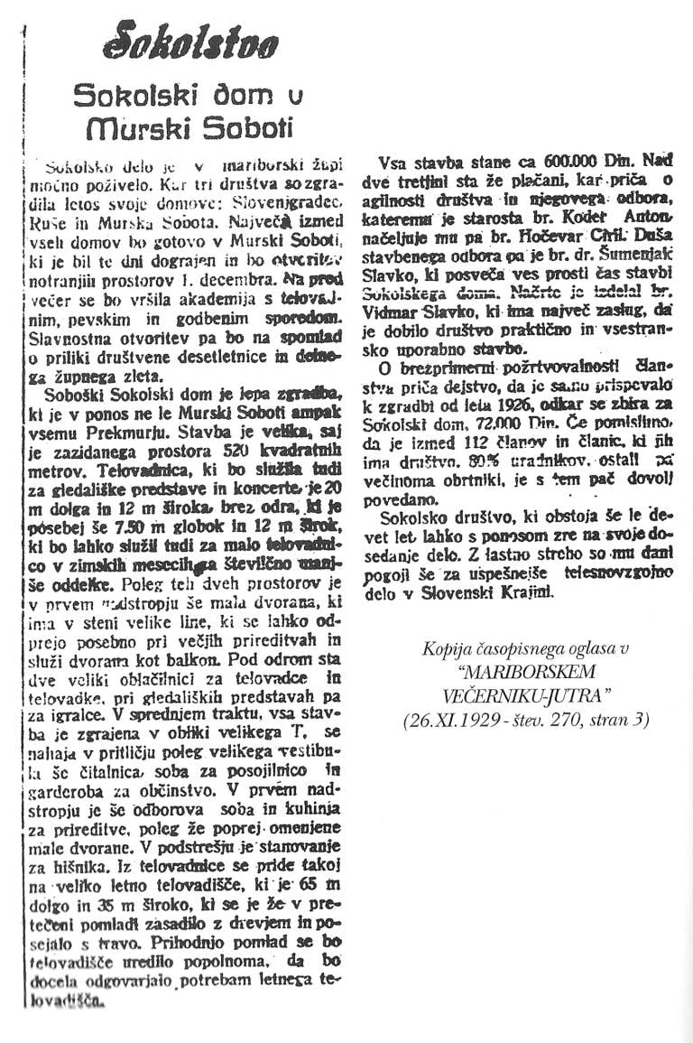 Gre za enega prvih telesnokulturnih domov v Prekmurju, ki je nekoč veljal za središče telesnega in kulturnega napredka v našem okolju. Objekt v Mladinski ulici 3 je v skladu z Odlokom o razglasitvi nepremičnih kulturnih in zgodovinskih spomenikov na območju občine Murska Sobota razglašen za spomenik stavbne dediščine, a je danes že močno dotrajan in nujno potreben prenove.