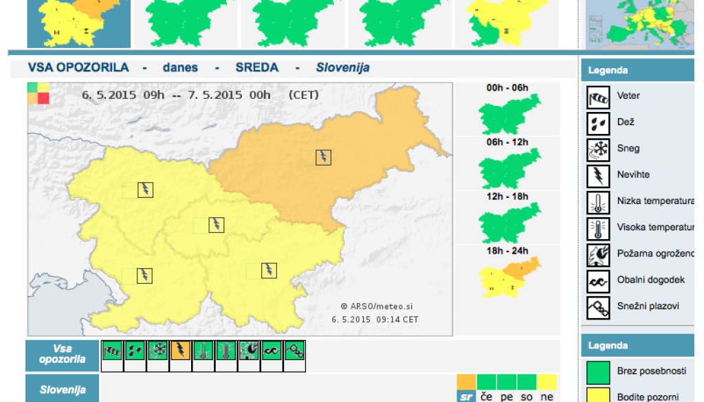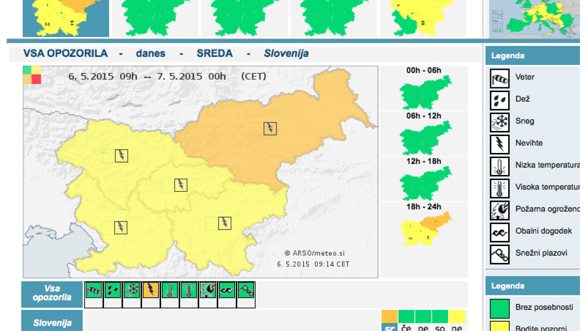 Vremenoslovci opozarjajo, da se bodo pozno popoldne in zvečer predvsem na severovzhodu države pojavljale krajevne nevihte z močnejšimi sunki vetra, lokalno ni izključena tudi toča. Za to območje so tako razglasili oranžno stopnjo ogroženosti. Zvečer in ponoči bo občasno deževalo tudi drugod po državi, možne so tudi nevihte, a ne tako močne kot na severovzhodu.
