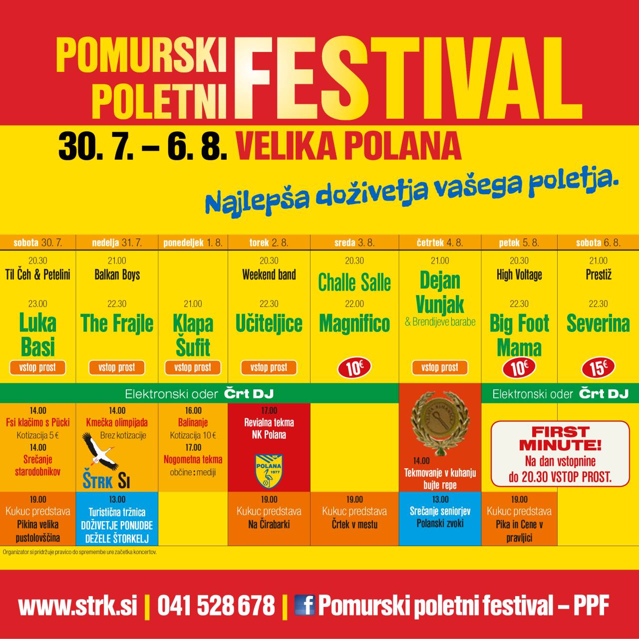 Pomurski poletni festival (PPF) se v soboto, 30. julija, pričenja ob 14. uri s kolesarjenjem vseh generacij in dogodkom Fsi klačimo s Pücki. Polanskim Pückom se bodo tradicionalno pridružili tudi starodobniki. Glasbene večere bodo pričeli mladi glasbeniki skupine Til Čeh in petelini, za noro zabavo prvega večera pa bo poskrbel Luka Basi.