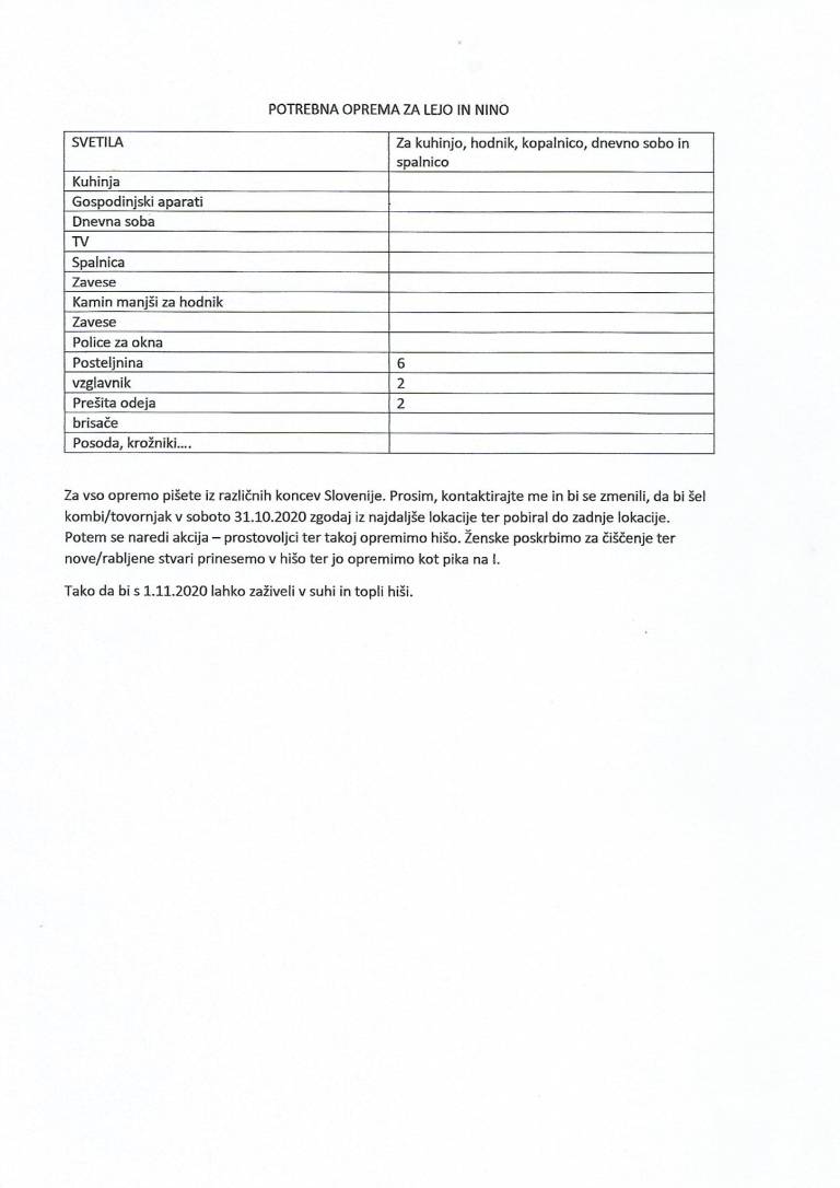 Kot so zapisali pri društvu, za vso to opremo pišejo ljudje iz vseh krajev Slovenije. Zato predlagajo, da se jih kontaktira, v soboto 31.10.2020 pa je planirano, da iz lokacije društva odrine kombi oziroma tovornjak, ki bo ves dan pobiral material od prve do zadnje lokacije. Želijo si, da bi bili sestri v novi, topli in suhi hiši s 1. novembrom.