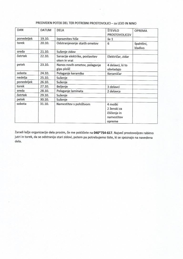 Potrebujemo vodovodarja, električarja, zidarja, montažerje plošč in keramičarje. Za jutri bi potrebovali prostovoljce, in sicer za odstranjevanje starih zidnih oblog.