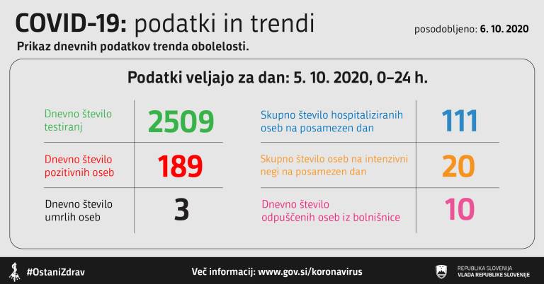Včeraj, 4. oktobra 2020, so v Sloveniji opravili 2.509 testiranj na koronavirus. Potrdili so 189 novih okužb.