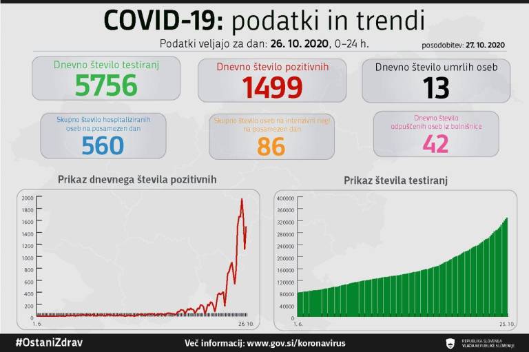 V Sloveniji so v ponedeljek, 26. oktobra, opravili 5756 testiranj na koronavirus in potrdili 1499 novih okužb, delež pozitivnih je bil 26,04 odstotka vseh testiranih.